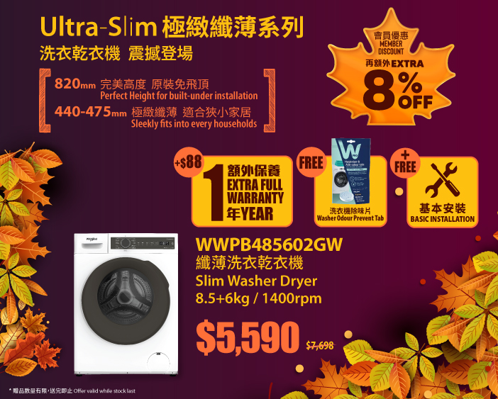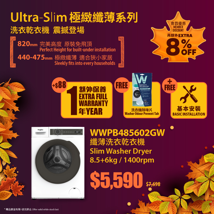 WWHB485602GW8.5+6kg Slim Washer Dryer